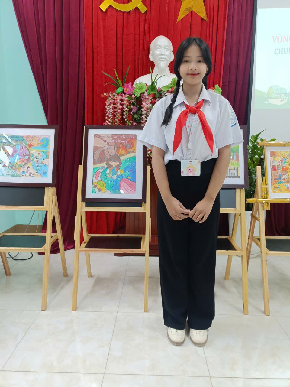 Giải Khuyến khích: Em Nguyễn Thị Bảo An – Học sinh lớp 7E với tác phẩm “Chung tay bảo vệ Trái Đất – Ngôi nhà chung”, thể hiện tinh thần đoàn kết toàn cầu, lan tỏa thông điệp cùng nhau hành động vì một tương lai bền vững.