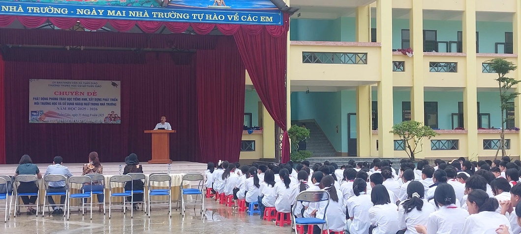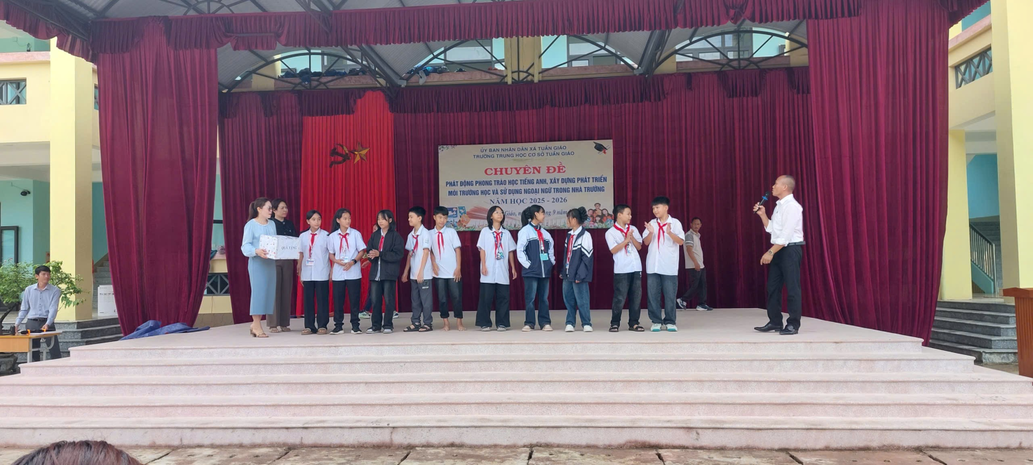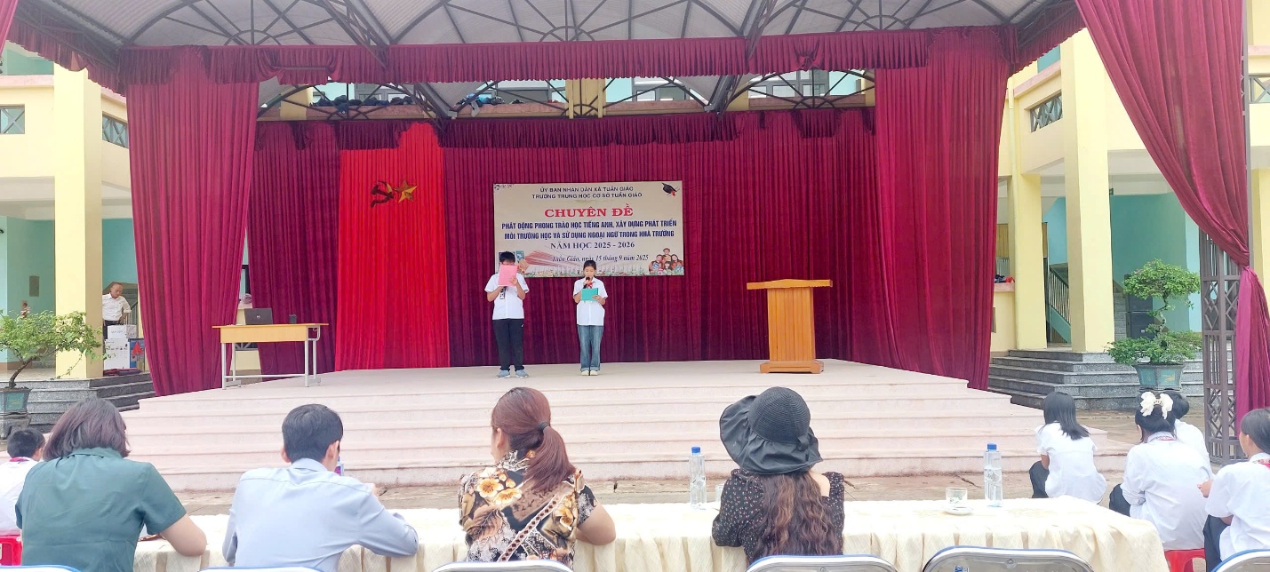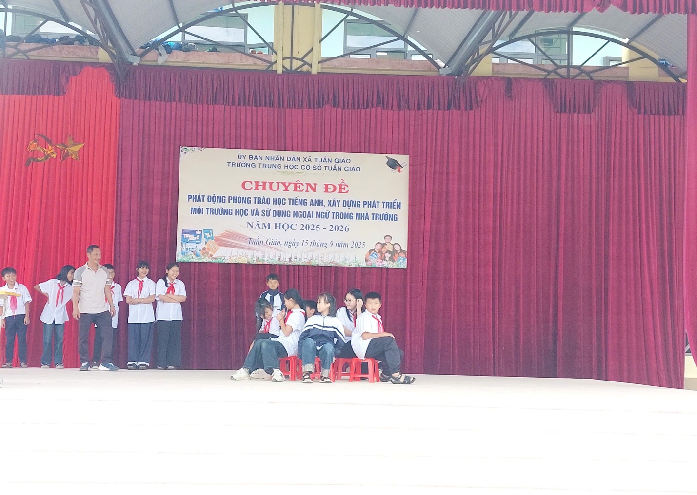 TIẾNG ANH LÀ "SIÊU NĂNG LỰC" - BẠN ĐÃ SẴN SÀNG KÍCH HOẠT? ⚡🚀 Chào các bạn học sinh trường THCS Tuần Giáo thân mến! Các bạn có bao giờ mơ ước được xem phim Marvel không cần vietsub, hiểu hết lời bài hát của các idol quốc tế, hay tự tin "bắn" tiếng Anh khi tình cờ gặp một người bạn nước ngoài trên phố chưa? Tiếng Anh không hề đáng sợ như những bài kiểm tra đâu! Nó thực chất là một "siêu năng lực" giúp các bạn khám phá cả thế giới rộng lớn. Để giúp chúng mình cùng nhau giỏi lên, trường THCS Tuần Giáo tổ chức: ✨ PHÁT ĐỘNG PHONG TRÀO HỌC TIẾNG ANH - NĂM HỌC 2025-2026 ✨ 📅 LỊCH TRÌNH "CẬP BẾN" CỦA CHÚNG MÌNH: Thời gian:7h00’-7h45’ ngày 15/9/2025 Địa điểm:Tại sân trường THCS Tuần Giáo Trang phục: Đồng phục trường và một tinh thần "máu lửa"! 🎈 BUỔI LỄ CÓ GÌ MÀ "HOT" THẾ? - Mở đầu là thầy giáo Nguyễn Anh Tuấn (Giáo viên bộ Môn Tiếng Anh) Phát động phong trào học và sử dụng Tiếng Anh. - Để hưởng ứng lời phát động của thầy giáo Nguyễn Anh Tuấn hai học sinh lên hưởng ứng; Nguyễn Trường Giang (Lớp 8E) và Phạm Ngọc Linh (Lớp 8D)