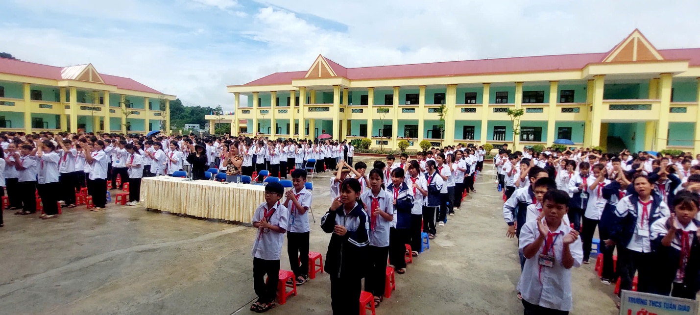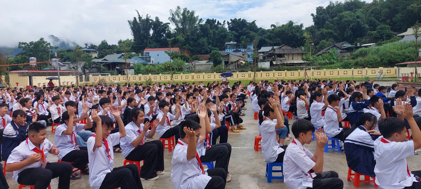 Không chỉ là ngồi nghe đâu nhé, các bạn học sinh cũng được được tham gia vào chuỗi hoạt động cực kỳ thú vị: 1. Sân khấu hóa Tiếng Anh: Bằng màn đồng diễn của 43 giáo viên và 843 học sinh của nhà trường trên nền nhạc “Ta hát to hát nhỏ” 2. Đố vui nhận quà: Thông qua hai trò chơi “Ai nhanh hơn” dựa trên nền nhạc “Gangnamstyle” 3. Giao lưu cùng bạn học Ngoại ngữ: Thông qua trò chơi “Băng tải” trên nền nhạc “Boom boom boom” Kết thúc là phần nhận quà đầy hào hứng và phấn khích 💡 BÍ KÍP NHỎ: Đừng lo nếu bạn còn thấy mình "mất gốc" hay ngại nói. Phong trào này ra đời là dành cho TẤT CẢ CHÚNG TA. "Học một ngoại ngữ mới là sở hữu một tâm hồn thứ hai." - Cùng nhau, chúng mình sẽ làm được! 🔥 HÀNH ĐỘNG NGAY THÔI! Các bạn hãy cùng thầy cô và bạn bè biến mỗi hành lang, mỗi lớp học của trường THCS Tuần Giáo đều vang lên những lời chào bằng tiếng Anh thật rộn ràng nhé. Kết thúc buổi phát động là màn đồng diễn toàn trường trên nền nhạc “Wheels on the bus”